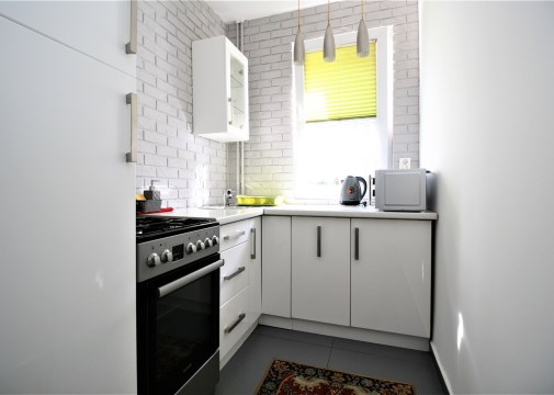 widnej kuchni z zabudową i sprzętem AGD (lodówka, kuchenka gazowa, mikrofalówka, czajnik),